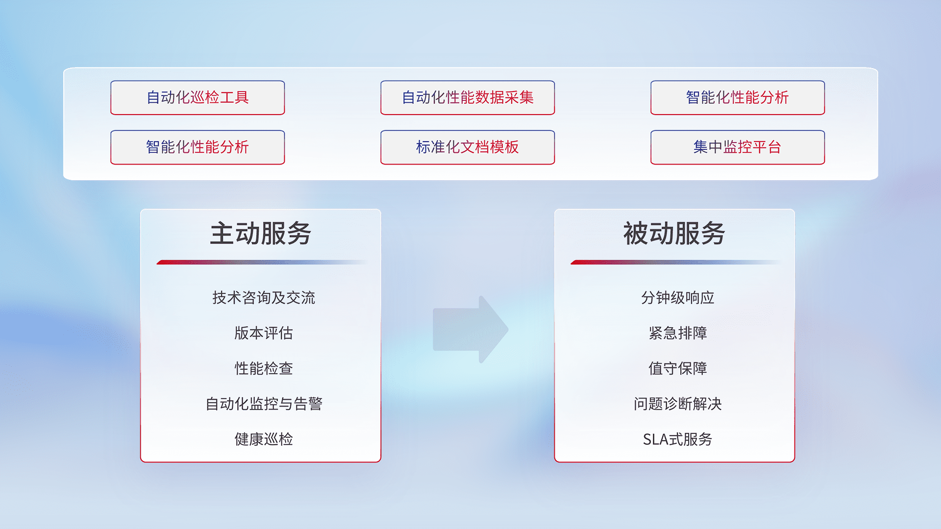 智能化工具和标准化文档,,保障服务质量,,,提供主动服务(包含技术咨询、、版本评估、、、、性能检查、、自动化监控与告警、、、、健康巡检)和被动服务包含(分钟级响应、、、紧急排障、、、值守保障、、、问题诊断解决、、、、SLA服务)。。。